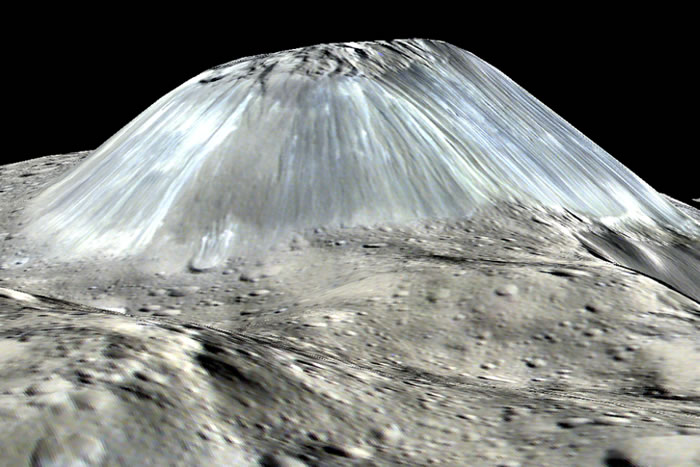 黎明号发现谷神星表面有座休眠火山──阿胡纳山,数亿年前曾经喷冰