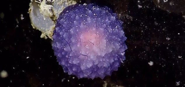 鹦鹉螺号探测船上的科学家们在加州沿海发现海洋神秘物种,一个小小紫色球状体藏在石头底下。