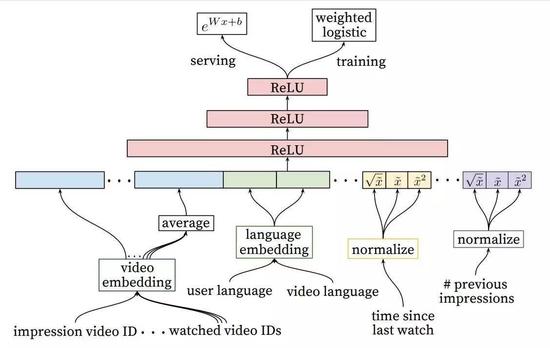 排名是更经典的机器学习问题,但是我们深度学习方法在性能上超过了之前对观看时间预测的线性与基于树的方法。推荐系统尤其受益于用户过去和事物之间的行为这样专门的特征。深度神经网络需要对类别和连续特征的特殊表征,我们对其分别使用嵌入与分位数标准化(quantile normalization)进行变换。我们发现深度的层可以有效地对数百个特征的非线性交互建模。