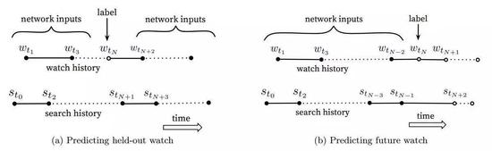 图5:给模型选择标签和输入上下文对离线评估来说很有挑战性,但是对实时性能有巨大的影响。如图,实心圆点?是网络的输入特征,空心圆点?是被去除的。我们发现在A/B测试上预测未来观看(5b)的表现更好。如5b所示,样本年龄表示为tmax ? tN,其中tmax是训练数据中的最大观测时间。