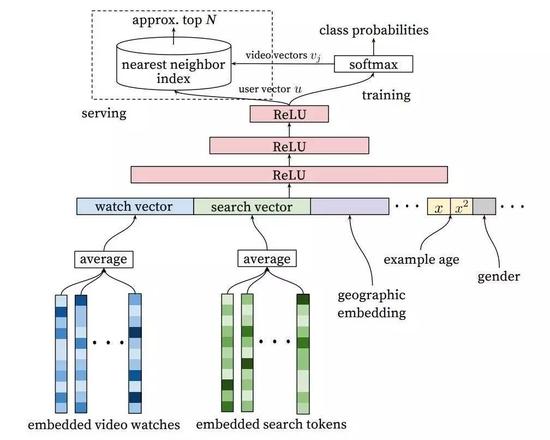 图3:深度候选生成模型架构:嵌入的稀疏特征是和稠密特征连结在一起的。在级联(concatenation)将可变大小的稀疏ID转换成适合隐藏层输入的固定宽度的向量之前,嵌入被取了平均。所有隐藏层是全连接的。在训练中,使用取样的softmax的输出之上的梯度下降对交叉熵损失进行最小化。在服务中,用一个近似最近邻(approximate nearest neighbor )查询生成数以百计的候选视频推荐。