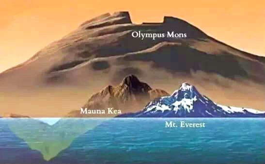 你知道吗?火星上奥林帕斯山的高度为达27公里,是地球最高峰珠穆朗玛的3倍多,是莫纳克亚山(总高度10203米,是世界上总高度最高的山)的2倍多。奥林帕斯山非常高直接升出了火星大气层。