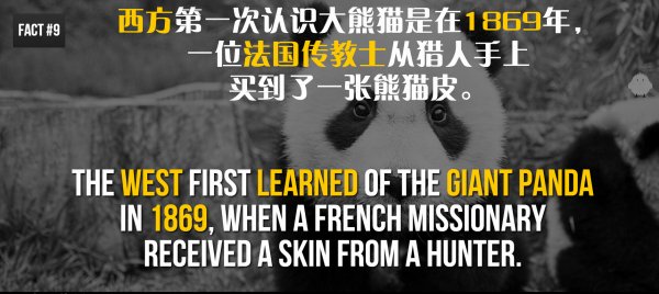 9.西方群众第一次认识到大熊猫是在1869年,一位法国传教士从猎人手上买到了一张熊猫皮。