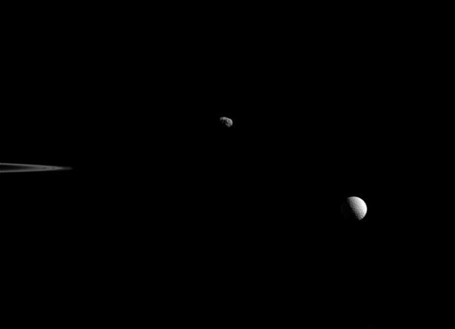 美国宇航局卡西尼探测器探测到土卫十(图像中心)和土卫一(图像右侧)位于土星环外侧,图像左侧呈现的是土星环外部边缘。