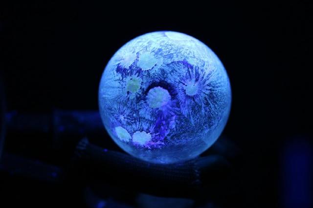 一颗迷人的蓝色星球?这其实是在圆底烧瓶中生长的一种萘酚衍生物结晶(7-溴-2-萘酚)。这是一种荧光物质,在紫外光的激发下,结晶发出的蓝色荧光照亮了圆底烧瓶,宛如暗夜中的星球。