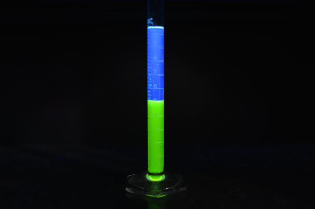 在两层不混溶的溶剂中分别加入荧光物质,在紫外光的照射下,就得到了这张双重的荧光。上层溶剂是己烷,其中溶解了苝(perylene),呈现蓝色荧光;下层溶剂是水,其中溶解了常见的荧光染料荧光素(Fluorescein),它会发出明亮的绿色荧光。