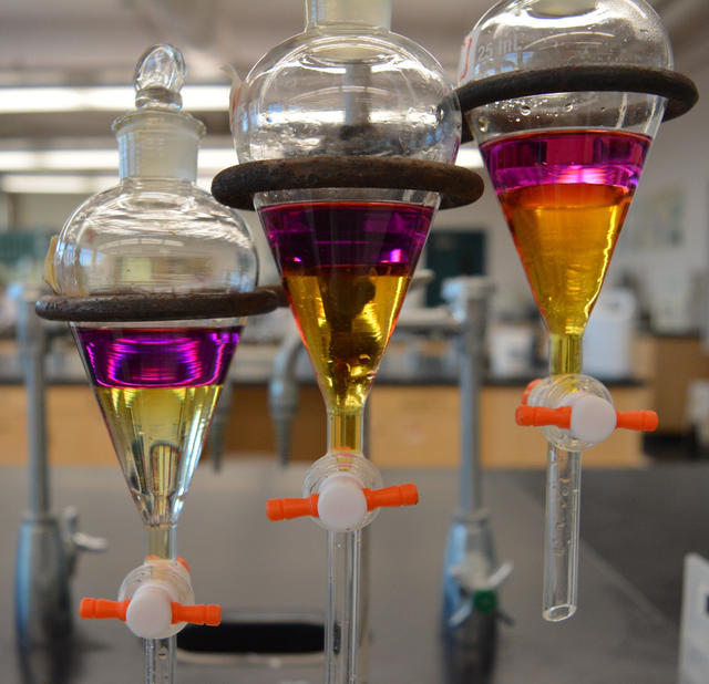 在图中,水层的颜色从左至右依次加深,而有机溶剂的紫色依次减淡,这是因为右侧分液漏斗的水层中加入了更多的碘化钾,通过形成I3–,更多碘被“拉”到了水层。在一些太阳能电池中,会用到I3–和I-的互变来传递电荷。