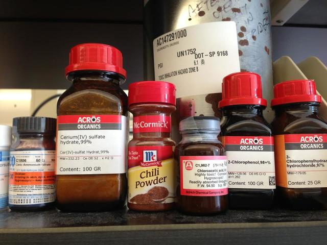 乔纳森·谢尔(Jonathan Scheerer)教授表示,自己其实也不太清楚这瓶辣椒粉究竟怎么跑到了自己实验室的架子上,不过它看起来和旁边的试剂真是毫无违和感……