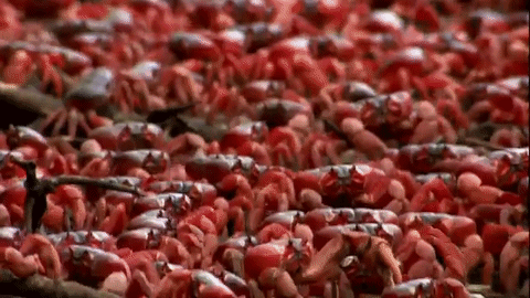 原来在沙滩交配完的成蟹,会把上亿颗蟹卵放置到海中,一个月后这些孵化的幼蟹,又会从海里爬上岸,涌进森林里的巢穴,造成第二波红潮的进击啦~