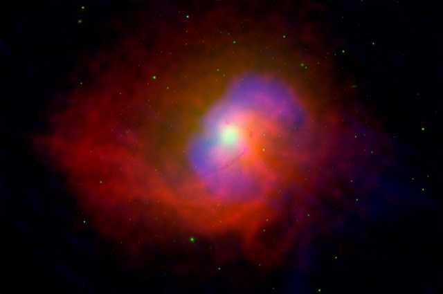 另外,在NGC 4696的中央有一个极其活跃的超大质量黑洞。天文学家通过对各大望远镜收集的数据进行分析,推测这个黑洞能够向外产生接近光速的物质喷流。下图为NGC 4696在多个波段的合成图,展现了其在三个波段上的爆发。其中,红色为X射线、蓝色为无线电、绿色为红外线。