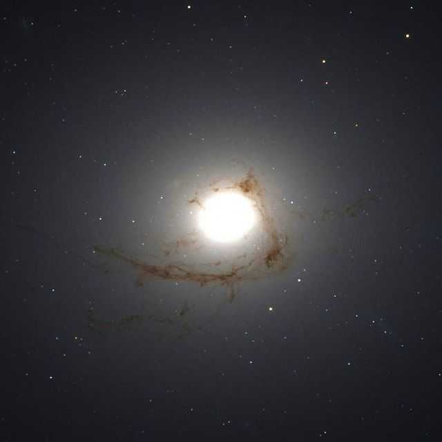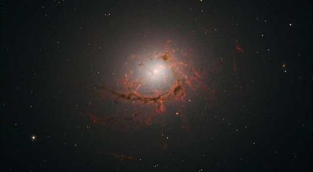 他们发现,这些细丝状物质实际上是一条巨大的尘埃气体带,横跨30000光年,厚度约200光年,密度相对较大,高达周围气体的10倍。据估计,这些细丝状物质的总质量相当于160万个太阳。下图为哈勃太空望远镜最新拍下的NGC 4696的图像。