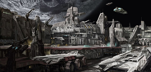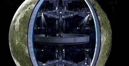 巨型机器熔化月球内部的岩石并打出大洞,并将熔化的废物排到表面上。这架巨大的飞行器被船壳般的内壳和重新打造的金属废弃物的崎岖外壳保护,所以能够一路驾着它穿越宇宙空间,最后停在环绕地球的轨道上。