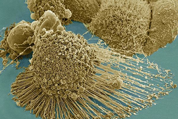 电子扫描显微镜下拍摄到的癌细胞,长有大量的丝状伪足,使它们能在人体内转移。