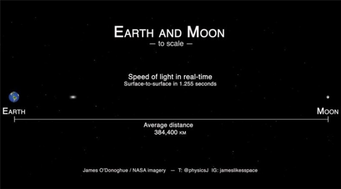 第二影片则将背景改到外太空,纪录光从地球跑到月球所需的时间,地球到月球的平均距离是38.4万公里,光从地球跑到月球单趟需1.255秒,来回一趟则约2.51秒。这代表我们在地球所看到的月光,实际上却是1.255秒前的月光。