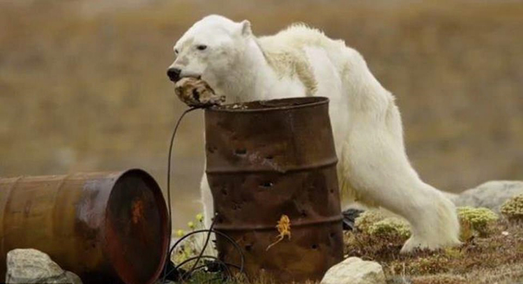 因为全球暖化,北极的冰一直慢慢融化,北极熊被逼着往南走,没有办法像以前一样去猎食栖息在冰上的海豹。拍摄这些照片跟影片的摄影师Paul Nicklen(生物学家),他曾见过超过3000只熊,但这只北极熊让他印象最深。难过的是,因为加拿大法律禁止人类喂食北极熊,而且即使Paul真的偷偷喂了,这也只是稍微延长一点时间而已,最后这只熊应该还是会饿死。