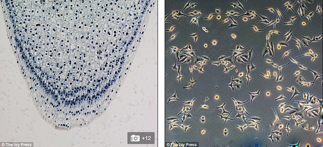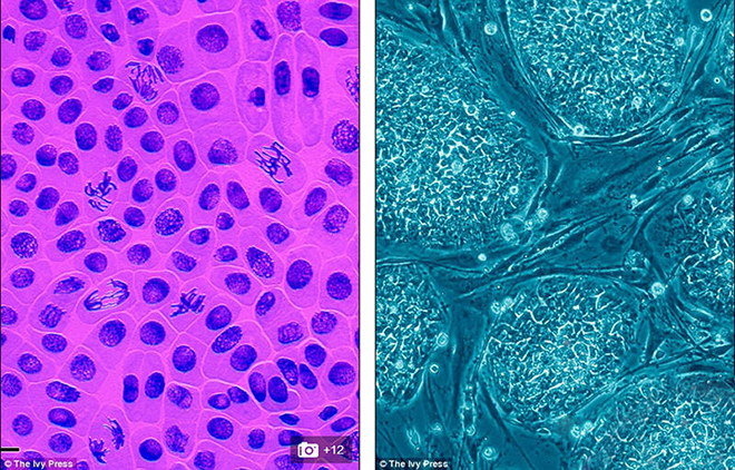 左图是蚕豆干细胞,图中细胞核是深蓝色部分,其中一些细胞核出现有丝分裂;右图是人类胚胎干细胞,斑点结构是存活在培养皿中的人类胚胎干细胞。
