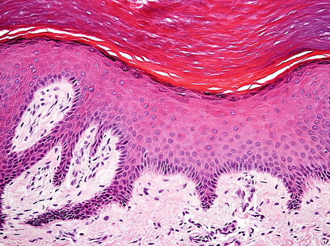 图中显示的是人类皮肤细胞,图中顶部两个深粉色组织层构成表皮,这种触须结构延伸至淡粉色真皮,表皮有4种类型细胞,其中角质细胞通过制造角蛋白,使人类皮肤更结实、柔韧和防水;黑色素细胞通过制造黑色素使人类皮肤呈现不同肤色。