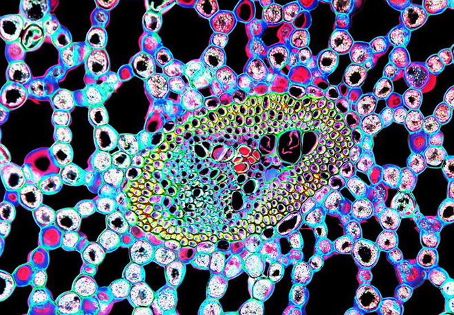 目前,科学家杰克-查罗纳(Jack Challoner)最新出版一本192页新书——《细胞:构建生命的视觉旅行》,书中刊登了250幅生物细胞显微图像,并对图像进行了文字描述。如图所示,图中美丽的簇状结构是白菖蒲植物地下根茎的横切面。