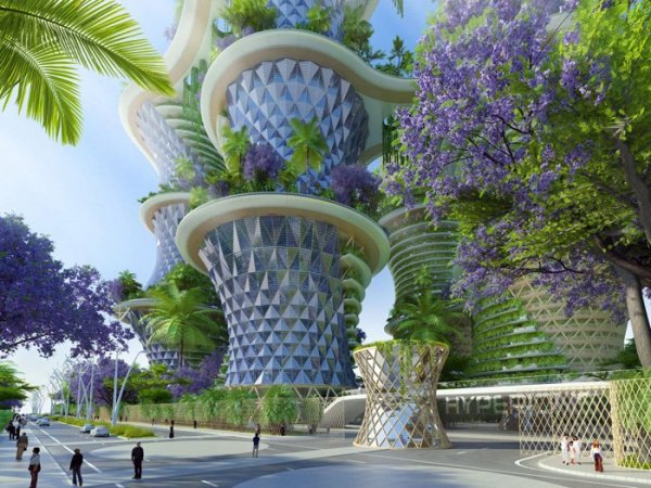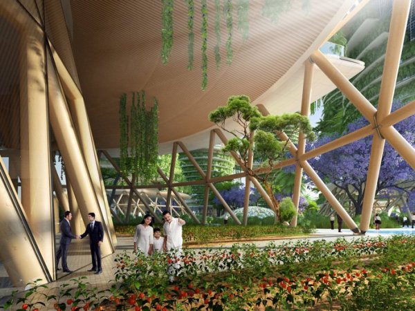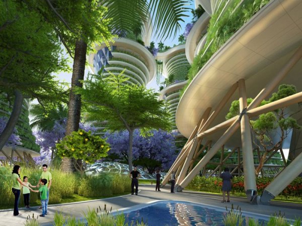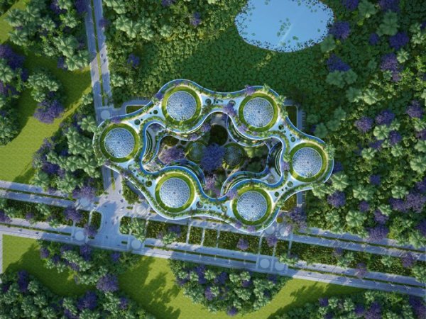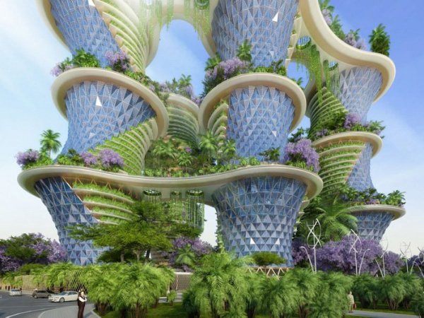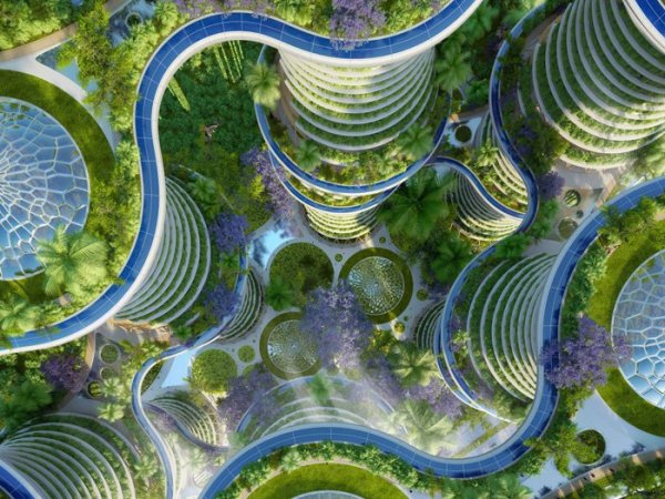 《阿凡达》虚构世界中的有机曲线设计离我们其实并不远。印度农业生态学家 Amlankusum 和法国的文森特·嘉利宝事务所(vincent callebaut architectures)发布了关于垂直“生态街坊”的计划,名为Jaypee绿色体育城。