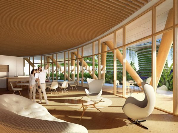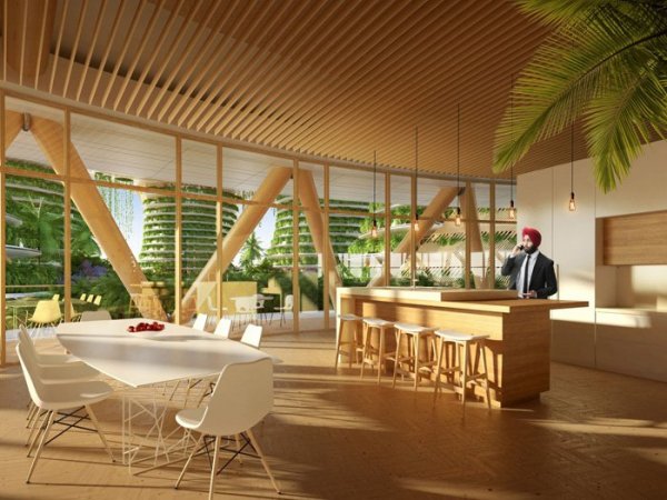 设计的这个“垂直村”能为企业提供灵活的空间,在太阳能外墙的一面进行办公,而生活空间则紧依水培绿色阳台。