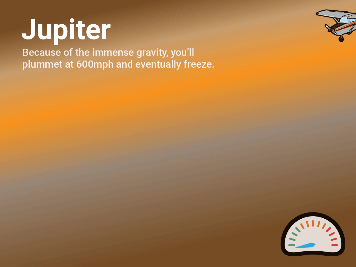 在木星上,飞机将增重2.3倍,因此你需要3倍功率才能飞行。飞机会在大气中获得一些浮力,因此你并不会垂直坠机,而是以600迈的速度滑翔并撞向星球中心。若不冻住,你将被巨大的压力碾碎。