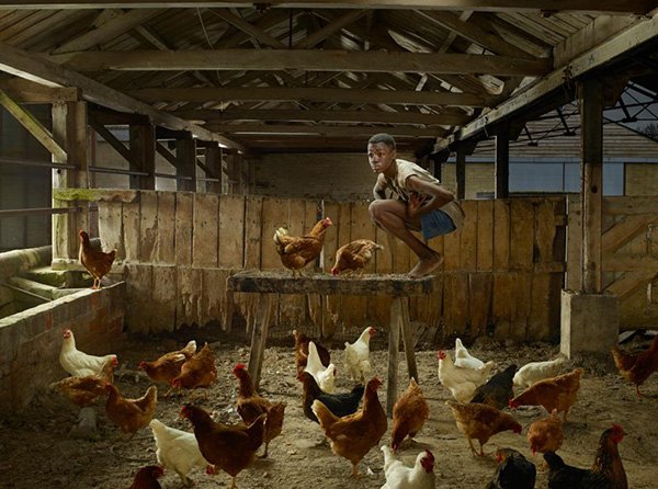 摄像师Fullerton-Batten在寻找这些不幸的孩子时得到了Mary-Ann Ochota的帮助,他是人类学家和电视节目主持人,去乌干达、乌克兰和斐济时找到了三个幸存的孩子。图中的人物是John Ssebunya,1988年John在三岁的时候目睹了自己的母亲被父亲杀害,并由此离家出走。他逃进了丛林里并和猴子一起生活。在1991年John被抓获,当时是6岁,被安置在一个孤儿院里。 由于模仿猴子的行走方式,John的膝盖布满老茧。后来John学会的说话并成为非洲儿童珍珠合唱团的一员。许多野孩子的故事就像现实一样荒诞。John的故事并不是孩子们恶作剧的套路,而是真实存在的案例。