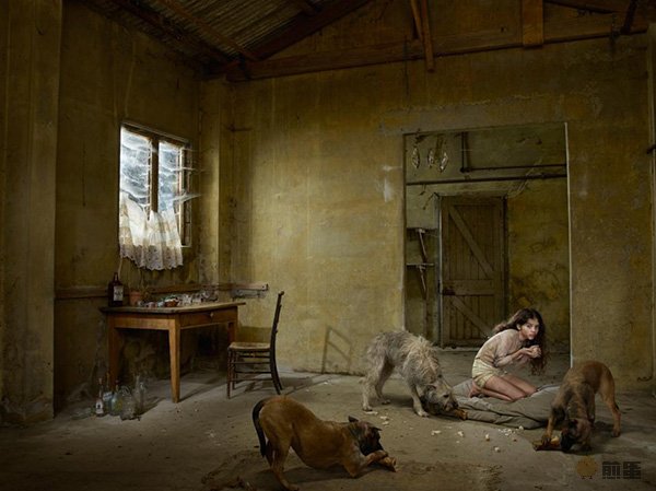 在摄像师Julia Fullerton-Batten最新的画展中有这些梦幻的、像童话一般的作品,美丽同时也令人不安。“然而这些描绘的生命是真是发生的。画展中主要有两种场景,一类是孩子消失在丛林中;另一类孩子却是在家里,由于被忽视和虐待,他们觉得相比于人,和动物们生活在一起更舒服自然,”摄像师向BBC 文化如此描述道。图一再现了乌克兰女孩Oxana Malaya的境地,Oxana于1991年被发现在和狗生活在狗窝里。她当时八岁并且和狗共同生活了6年。她的父母都是酒鬼,在她三岁的时候,有一天父母把她忘在了屋外,小Oxana爬进了狗窝和那些土狗蜷缩在一起以寻求温暖。事实上这么做救了她的生命。 她走路时手脚并用,喘气时伸出舌头,露出牙齿像狗一样吠叫。 由于何人缺乏交流, 她只懂得“YES”和“NO”两个词汇。 现在Oxana住在Odessa的一家诊所里,和医院里的农畜一起工作。