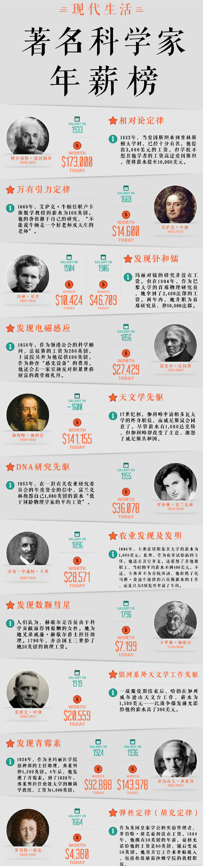 和他们的贡献比起来,这些科学家的整体工资非常低——爱因斯坦挣得最多,17.3万美元的年薪算高了,但跟如今的律师一比便不算多。不仅如此,不同科学家之间的工资差异也十分巨大。不过,之所以存在此差异,原因之一在于这仅仅是他们职业生涯中某一年的薪水,而非一辈子的工资。举例而言,爱因斯坦前往普林斯顿大学时已经功成名就,而牛顿则离发表引力理论还有20年之久。此外,简单地采用通货膨胀数据将数百年前的金钱转换为当今的货币这一做法本身也存在问题。