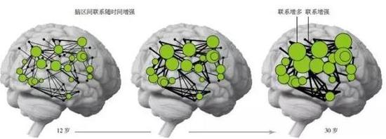 青少年大脑最显著的变化不是脑区的成长,而是神经元集群之间交流的增多。用图论分析技术分析磁共振成像扫描数据,显示从12岁到30岁期间,特定脑区或神经元集群之间的联系会变强(黑线变粗)。同时,某些特定区域内的联系会增多(绿圈变大)。这些变化最终将帮助大脑成熟,并胜任复杂思考和社会交际。