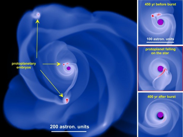 图片:这是藉由流体动力学计算,在重力作用下,不稳定环星盘(circumstellar disk) 的模拟图。由于重力引起的分裂(gravitational fragmentation),原行星’胚胎(embryo) ‘在尘盘内形成。三张小图片显示被恒星依序消灭的气团。Eduard Vorobyov, Universität Wien