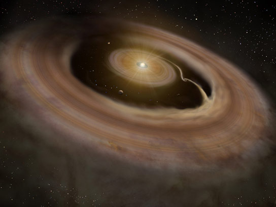 恒星诞生于星际间的气体与尘埃所组成的旋转云内,在自身重力作用下,收缩到形成恒星所需的密度。然而,在恒星处发现自己出现之前,由于角动量的守恒不灭,大多数的云落入到在恒星周围所形成的环星盘(circumstellar disk)内。物质经由环星盘转移到恒星的方法,导致恒星的大量产出,成为天文物理学新近的一个主要研究题目。