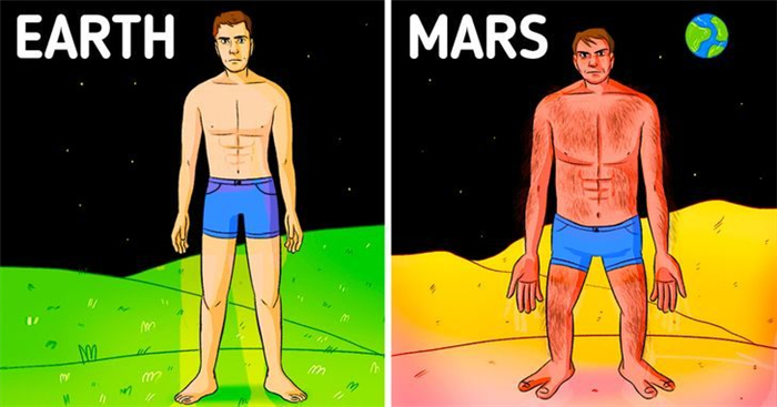 你的模样:较弱的引力使你长更高而且较健壮,眼睛变得更大,因为没有多少光线。为了抵御辐射,你身体的色素沉着会从黑色素变成类胡萝卜素 (让萝卜、番茄、橘子等水果呈现它们现在颜色的色素) 导致肤色偏橘红。