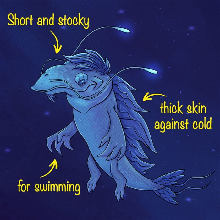 你的模样:更强的地心引力使你看起来更矮更壮,身体满是肌肉,皮肤较厚以抵御寒冷。由于生活环境几乎是液态、流动的,你的样子会像鲸鱼或海牛,在湛蓝的星球里游上游下。