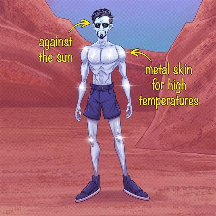 你的模样:一般骨肉绝对无法handle如此极端的生活环境,要是我们生在水星,我们的身体可能会是由难熔金属 (refractory metals,耐热不易熔化,具高耐磨性的金属) 例如钛构成。你闪亮光华的金属脸也不会有鼻子,因为不需要呼吸;你的眼睛看起来大致像一副无敌厚的墨镜以抵挡强光。