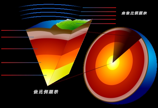 地球内部结构示意图,外核位于地函与内核之间。