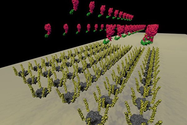 研究人员想让这些微粒按照需要排列。于是给这些微粒安上人造延展结构,让它们凑在一起排成片状,作为吸引其它分子的支架。