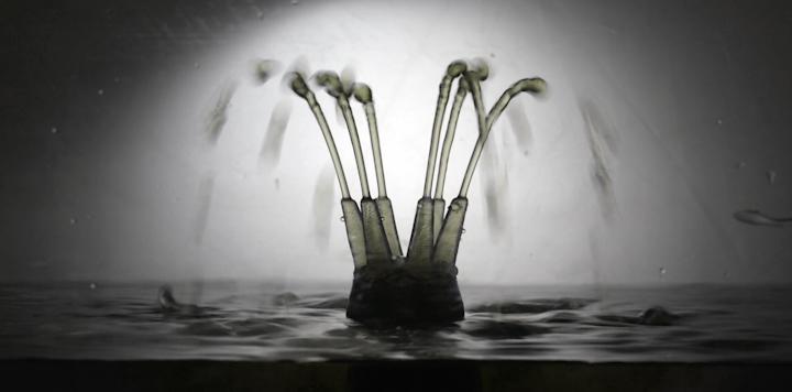 通过一个由3维打印的液态硅胶制造的可灌注管道网络,水被泵入一个微型有机凝胶支持材料中。