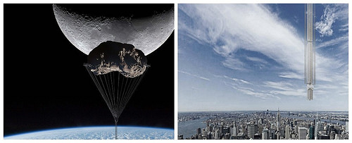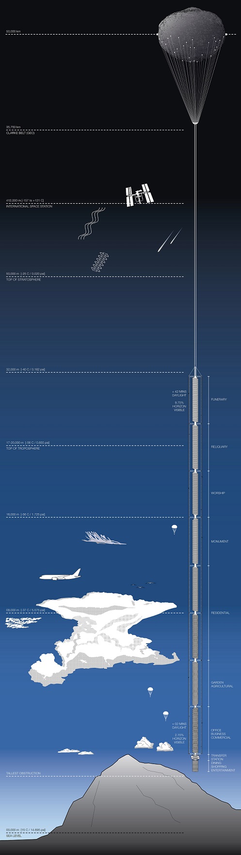 摩天大楼会被悬挂在一颗环绕在地表上方5万公里(31,068英里)的小行星。建筑物本身会被放置在地表上方大约32公里(20英里)处。