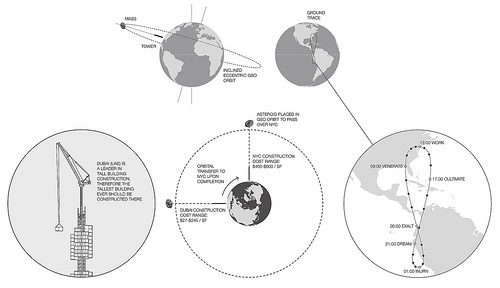 撇开技术性,所谓的日行迹塔(Analemma Tower)将被放在地球同步轨道(geosynchronous orbit)上。这是一个轨道,完美地匹配地球的自转。