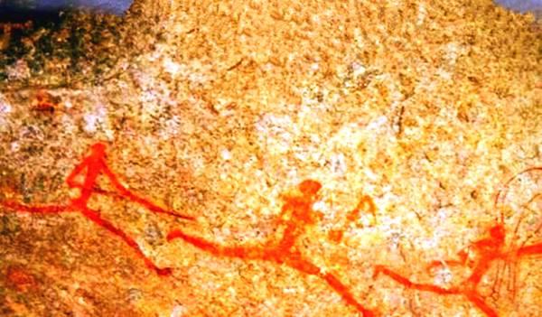 在这幅岩石壁画上,我们可以很清楚地看到原始人类在奔跑,而奇怪的是,他们的身边还有数条长蛇跟着他们一起快速游动。并且,细品画面的话,我们会有一种强烈的感受,这些壁画上的人类是在带着这些蛇在奔跑。这也是令人感到诧异的地方之一。