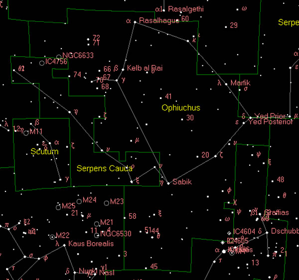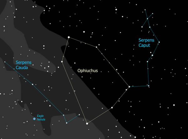 蛇夫座(Ophiuchus)是赤道带星座之一,从地球看位于武仙座以南,天蝎座和人马座以北,银河的西侧。蛇夫座是星座中惟一一个与另一星座-巨蛇座交接在一起的,同时,蛇夫座也是惟一一个兼跨天球赤道,银道和黄道的星座。蛇夫座既大又宽,形状长方,天球赤道正好斜穿过这个长方形。尽管蛇夫座跨越的银河很短,但银河系中心方向就在离蛇夫座不远的人马座内。银河在这里有一块突出的部分,形成了银河最宽的一个区域。
