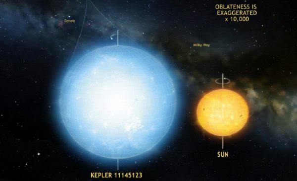 所有星星都在自转,结果就是会把自己甩扁。自转速度越快,星星就越扁。太阳每27天自转一圈,赤道半径比极半径长6.2英里;地球的赤道半径比极半径长13英里。Kepler 11145123体积是太阳的两倍多,自转速度比太阳慢三倍。