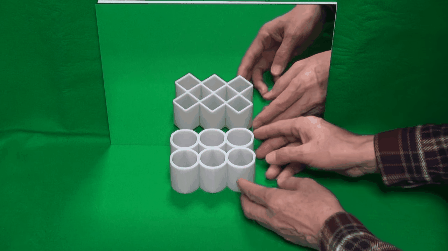 好啦...就不卖各位关子了,其实这并不是什么照妖镜,也不是遇到鬼啦(揍)。这是日本明治大学一位工程教授,杉原厚吉所构思出来的“圆柱假象”,透过正方体柱边上经设计过的弧面,转到特定角度后,就能看起来像圆形一样呢!