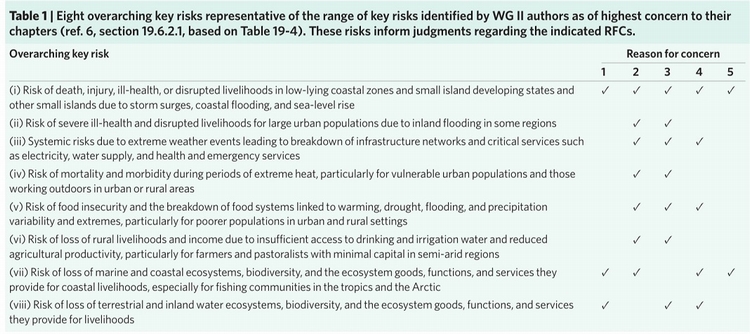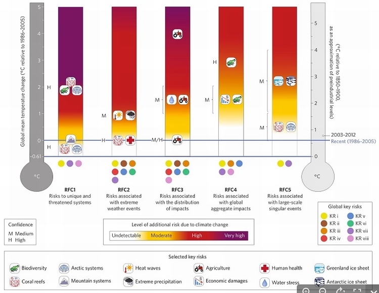 为了对你解释清楚,科学家刚刚发表一个新图表,在一个图像中评估气候变迁的所有风险。而且有很多的风险: