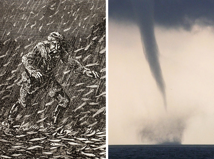 3. 鱼雨或其他生物的“下雨”现象。这是一种非常罕见的自然现象:下“动物雨”,有时候是鱼,有时候则是青蛙。第一个认真开始研究这个谜团的人是物理学家安德烈-马里·安培 (André-Marie Ampere)。他认为,突如其来的暴风可以抬起动物,当风消失时,动物就会像“下雨”地回到地面。后来,科学家们为这个理论增加了更多细节:它不仅仅是风,还是水龙卷风。这就可以解释当中一些动物被冻结的情况,因为龙卷风将它们吸到非常非常高。