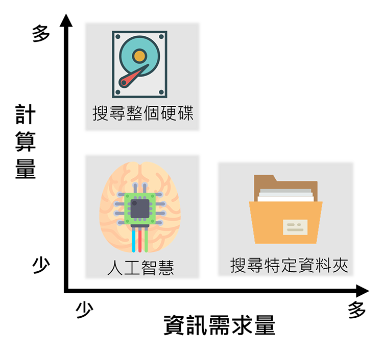 计算是为了获得更多资讯。如果我们事先提供许多资讯给算法,它计算量就低。例如:在电脑里搜寻档案,我们事先指定资料夹位置,搜寻很快就完成了。但如果我们忘记档案位置,要搜寻整个C槽,电脑要花好长一段时间(图一)。