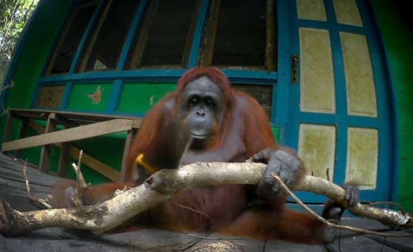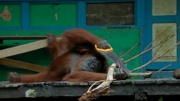 仿生红毛猩猩坐在废弃小屋外头,手里拿着一把锯子,拼命空锯眼前一段树枝。这时有只野生红毛猩猩刚好走过来,看见同类正在忙碌着,自己也跟着爬上小屋,捡起旁边另一把锯子,模仿同类的锯木行为。
