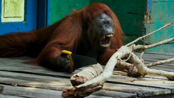 制作团队发现,这只红毛猩猩不只学会了如何锯木头,彷彿还有一点竞争的心理,一直想要快过旁边的仿生红毛猩猩。然而不知道为何而锯的它,很快就感到无聊,东倒西歪成各种锯木头的姿势……