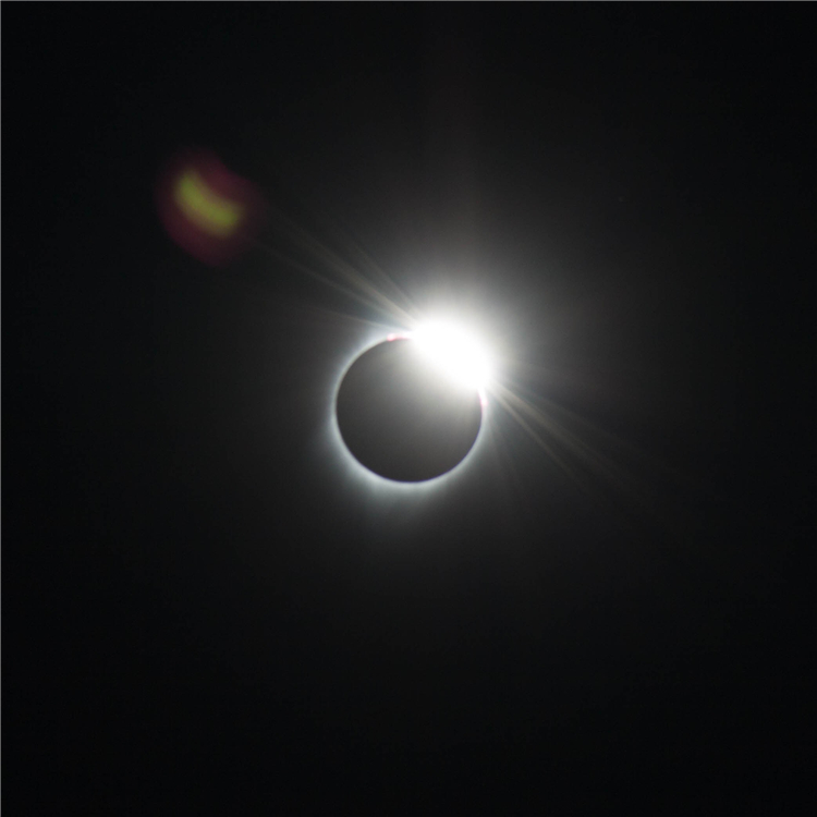 然后,就发生了。在减光片中看到太阳消失了,心里还纳闷道“这就是日全蚀?”。拿下减光片后[3],眼前的景象让人难以置信。就是像照片里一样:一颗黑色的太阳挂在空中。同时,天空变得几乎跟夜晚一样暗,气温遽降,冷风从四面八方吹来。换顾四周,依稀可以感觉到远方本影区以外的地区还是有太阳的,所以整圈360度的地平线都像是日出日落一样闪耀。日全蚀的景象非常奇异,除了人声欢呼之外,还可以听到动物害怕(或兴奋)地对太阳大叫。