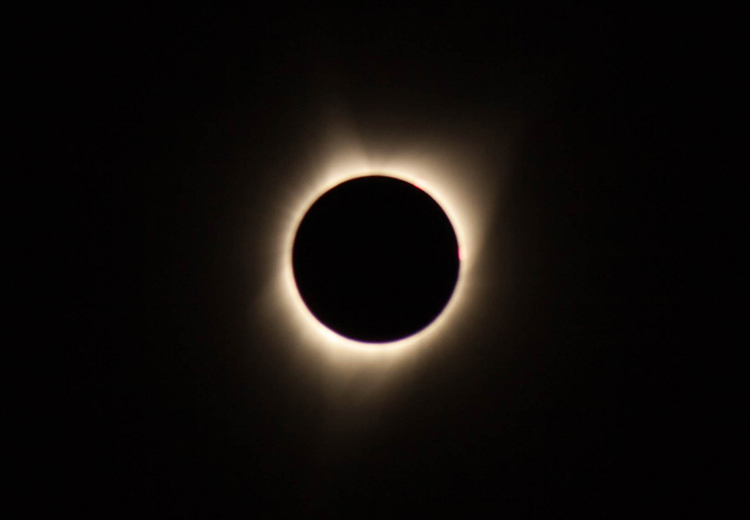 日全蚀。图中看到的光晕是日冕。在日冕和黑色圆形的边界上有一些红色的光斑(三点钟方向),它来自太阳的大气层中的色温层。